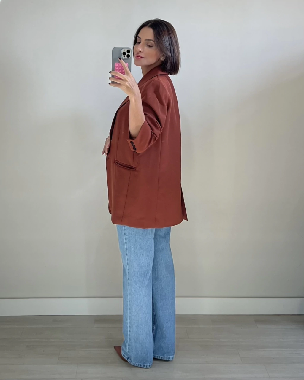 Confeccionado em tecido de qualidade, com toque sofisticado e caimento estruturado, ele é totalmente forrado e traz modelagem alongada e ampla, garantindo elegância e conforto na medida certa.